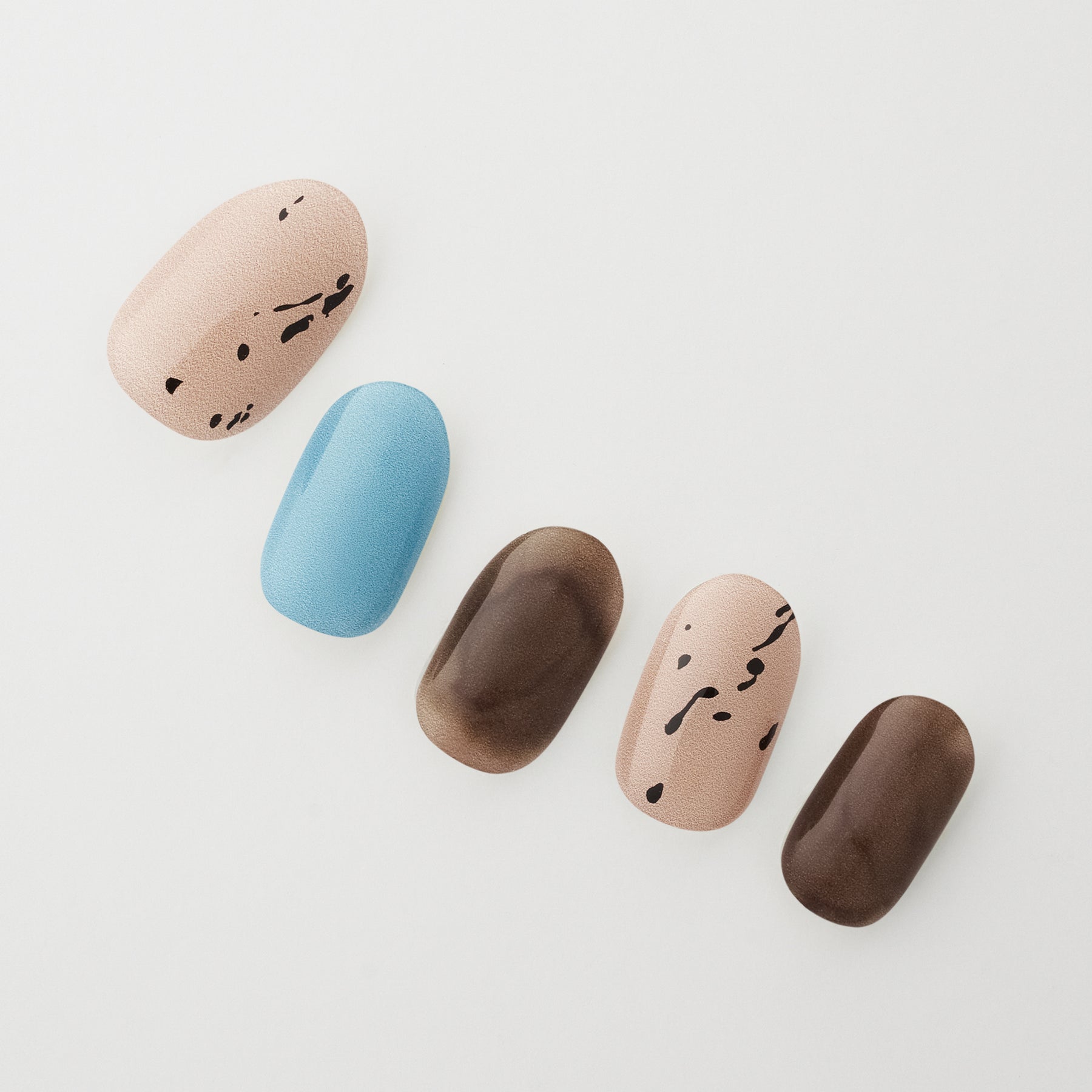 落ち着いたベージュをベースに、鮮やかなブルーを差し色としてプラス。茶色のまだら模様や柔らかな滲みが、指先に独特のニュアンスを生み出します。黒のアクセントを効かせることで、全体をピリッと引き締めた大人モードなデザイン