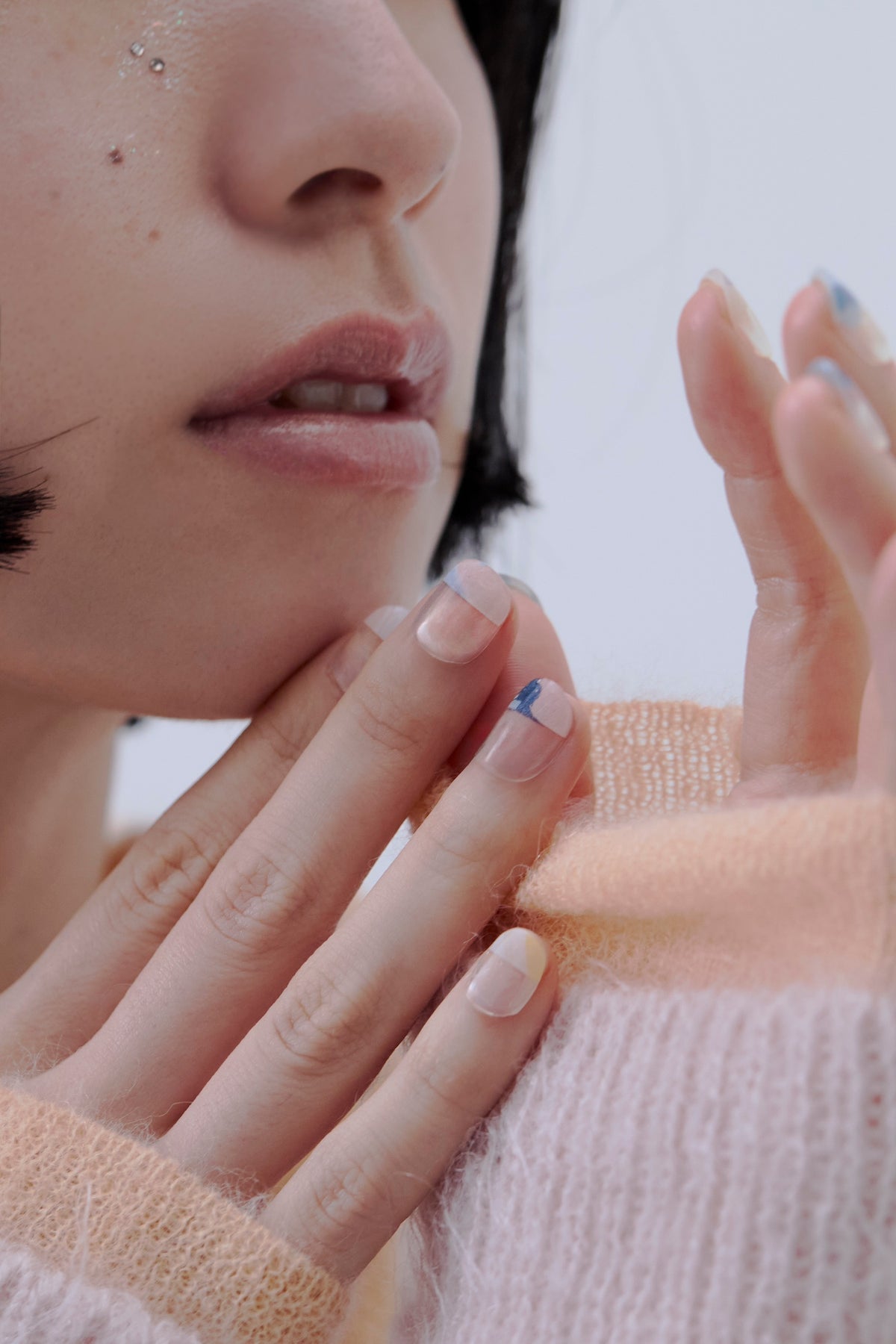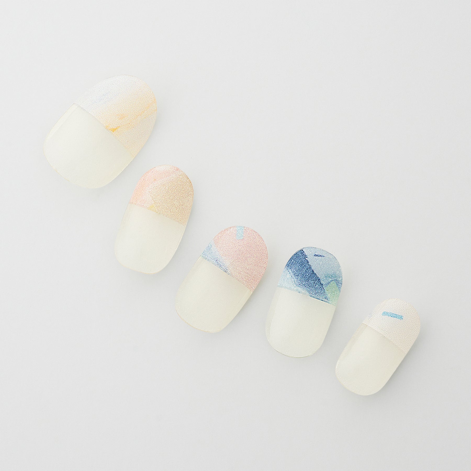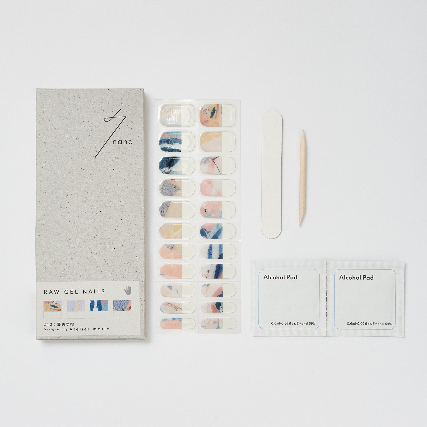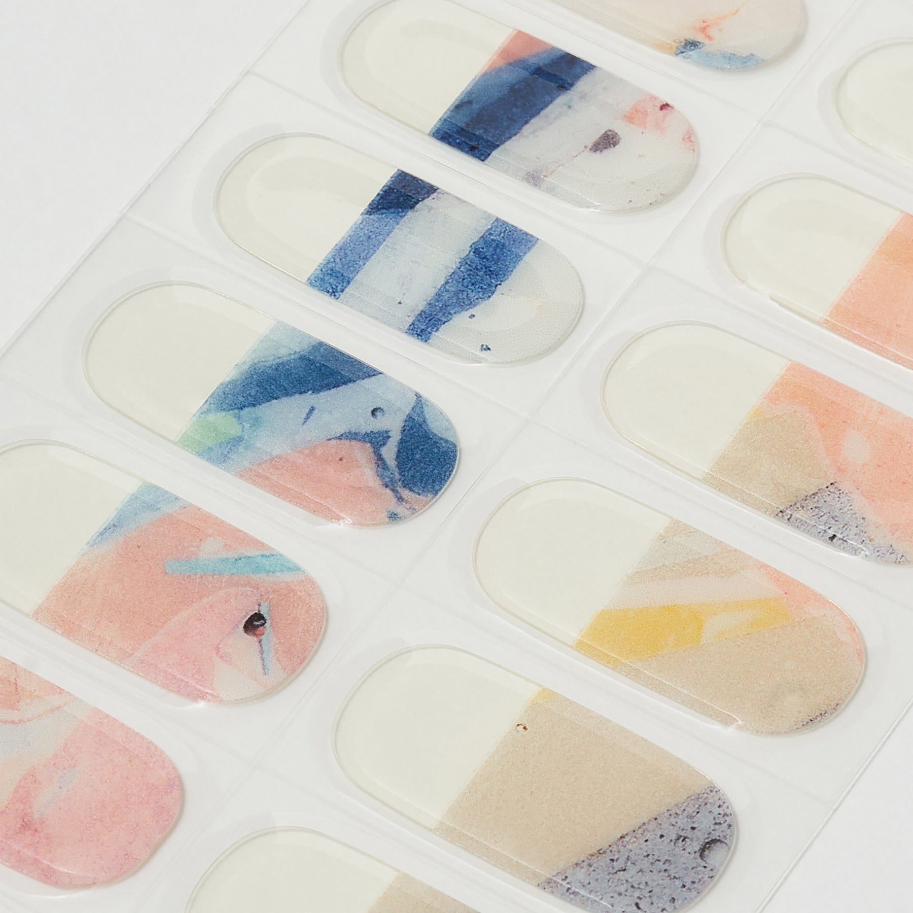 Atelier maticを象徴する、さまざまな素材が凝縮された樹脂の作品を組み合わせてデザイン。ベースはクリア地で、爪のサイズに合わせてカットすると、指先にマーブル模様が少しだけ残る絶妙なバランス感覚が魅力的です。ピンクやグリーン、ネイビーを自由に組み合わせ、指先を優美に彩って。