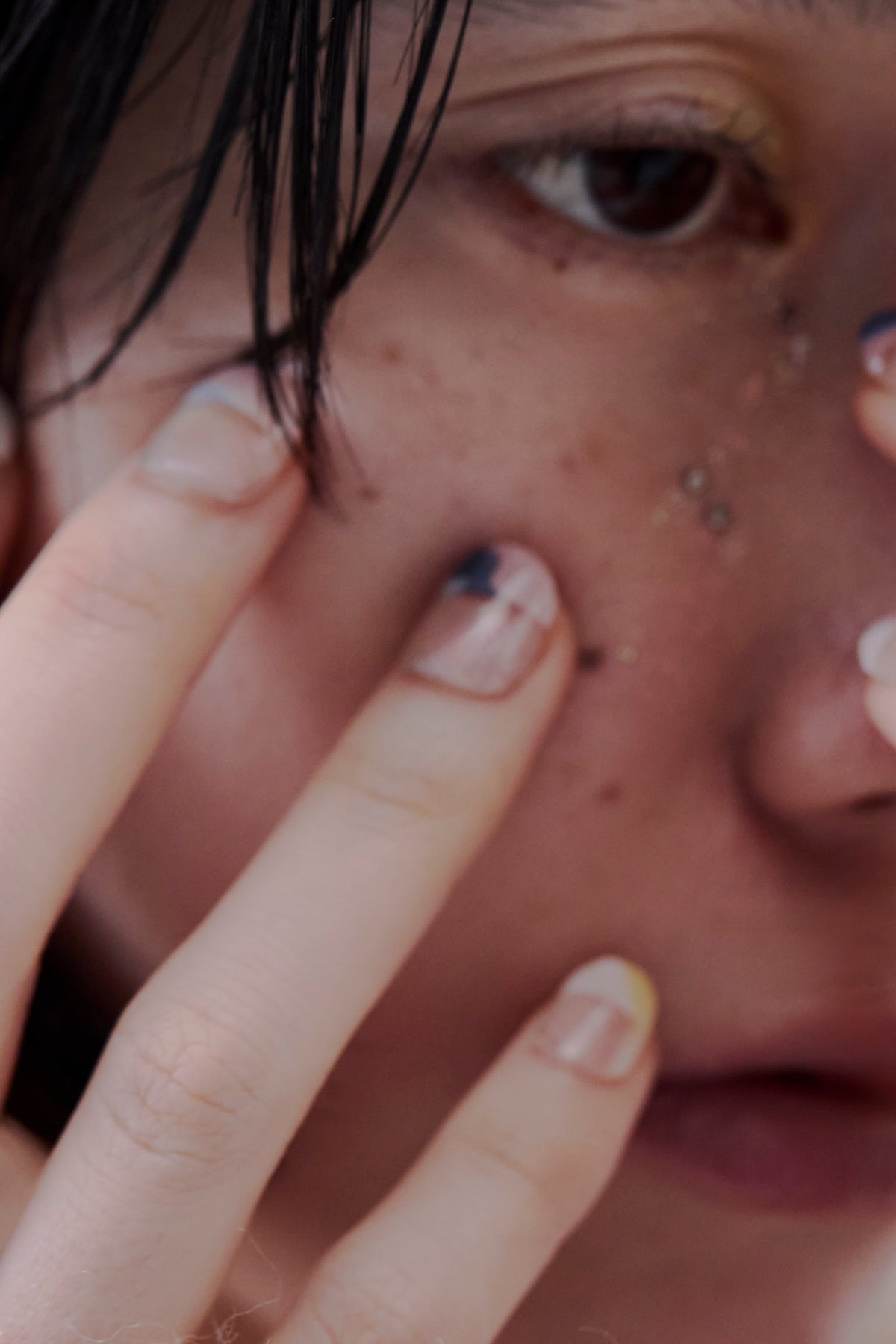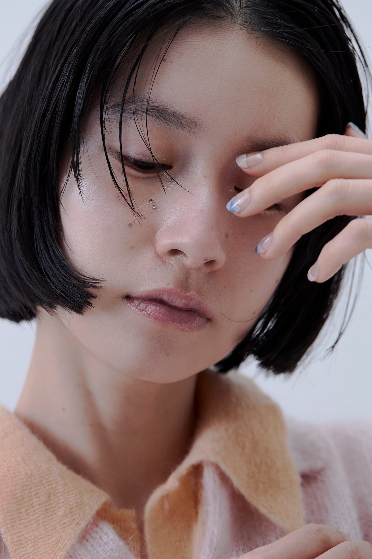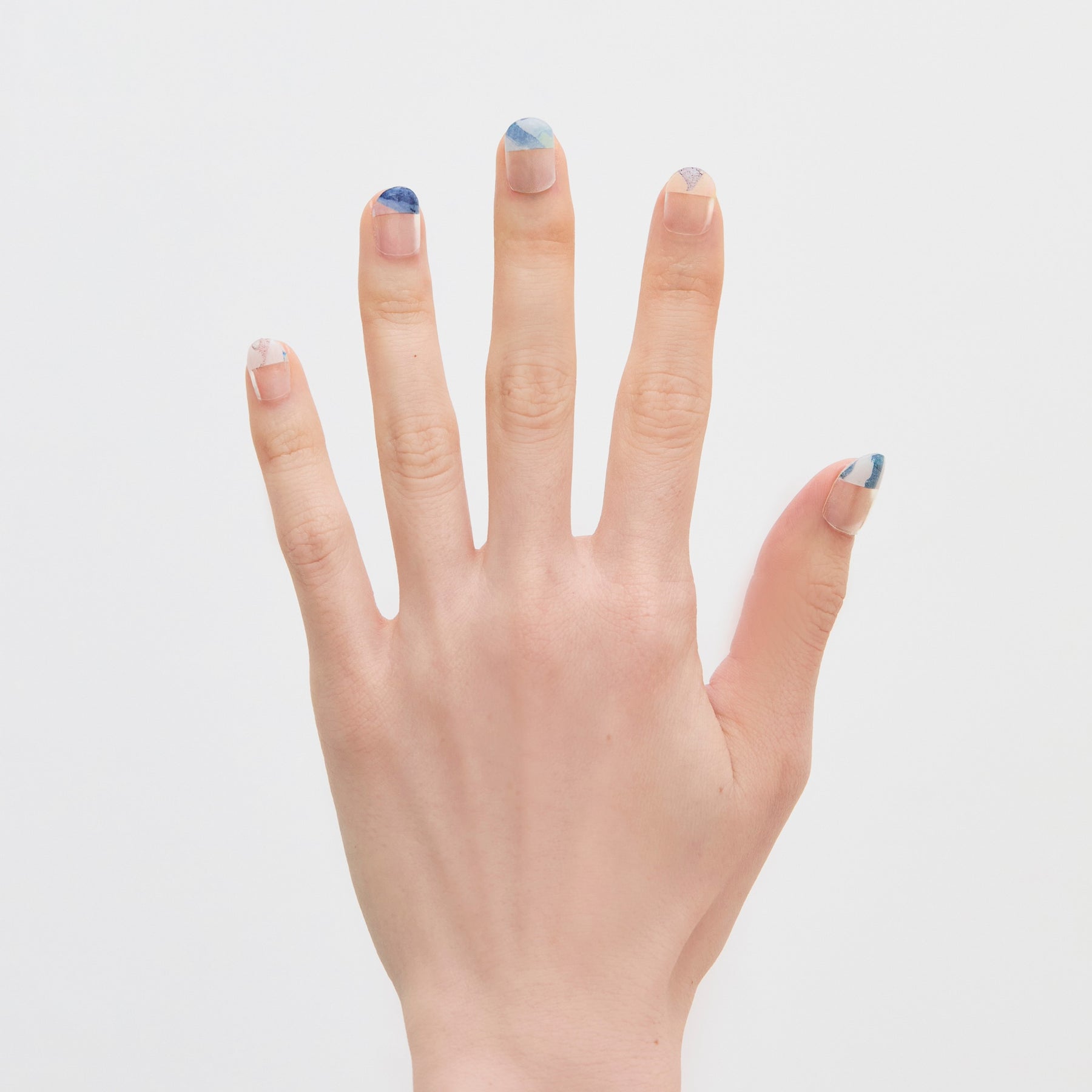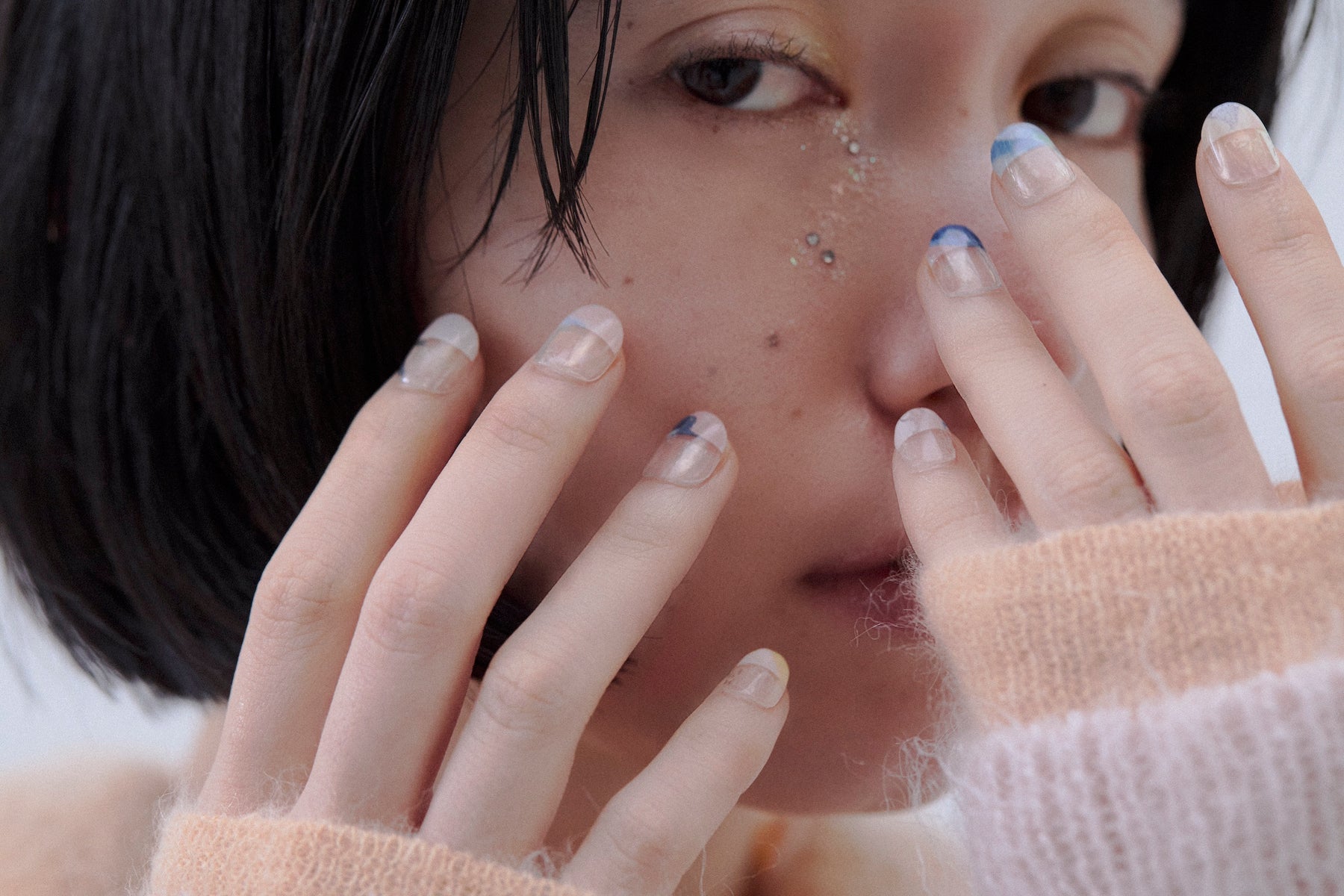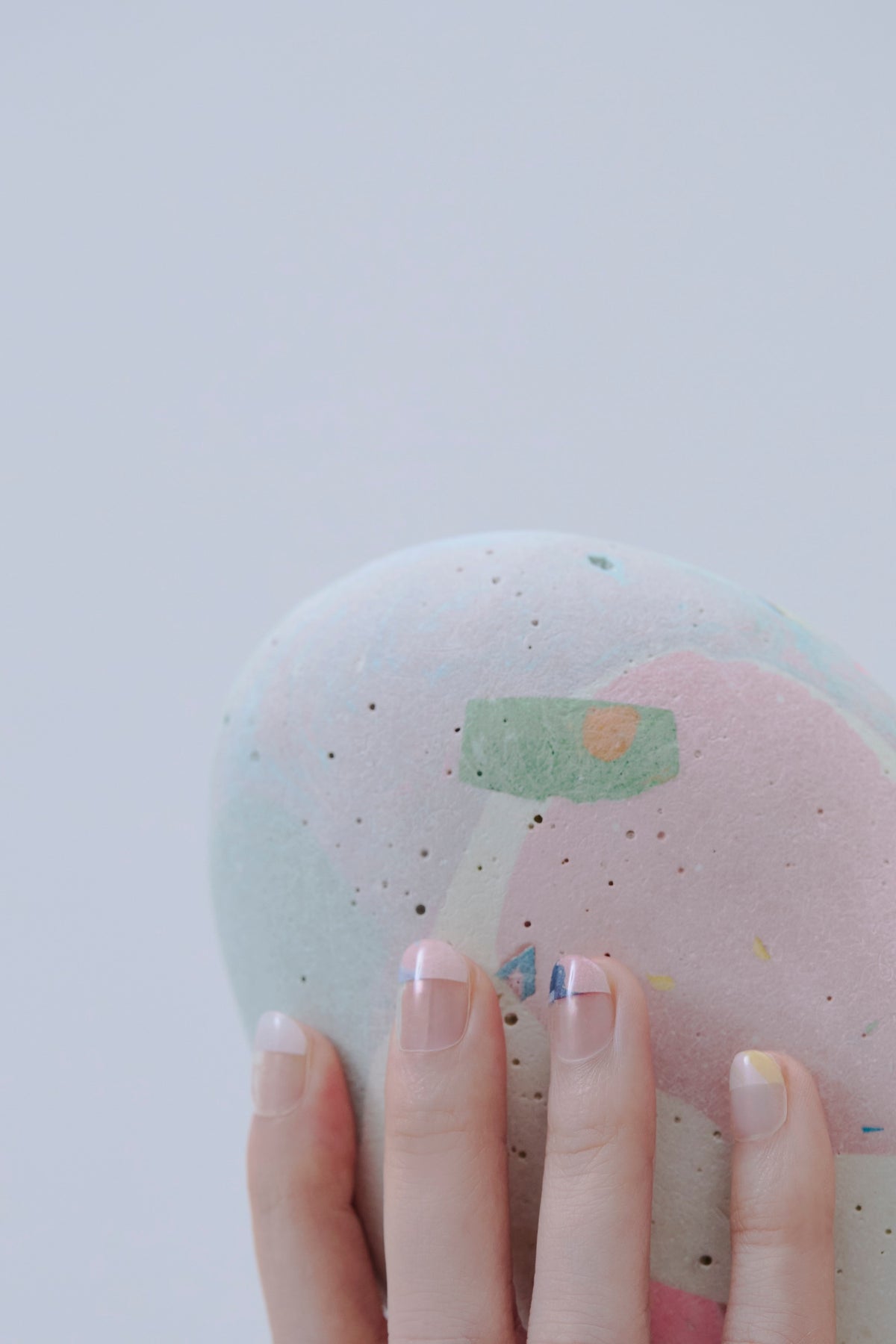 Atelier maticを象徴する、さまざまな素材が凝縮された樹脂の作品を組み合わせてデザイン。ベースはクリア地で、爪のサイズに合わせてカットすると、指先にマーブル模様が少しだけ残る絶妙なバランス感覚が魅力的です。ピンクやグリーン、ネイビーを自由に組み合わせ、指先を優美に彩って。