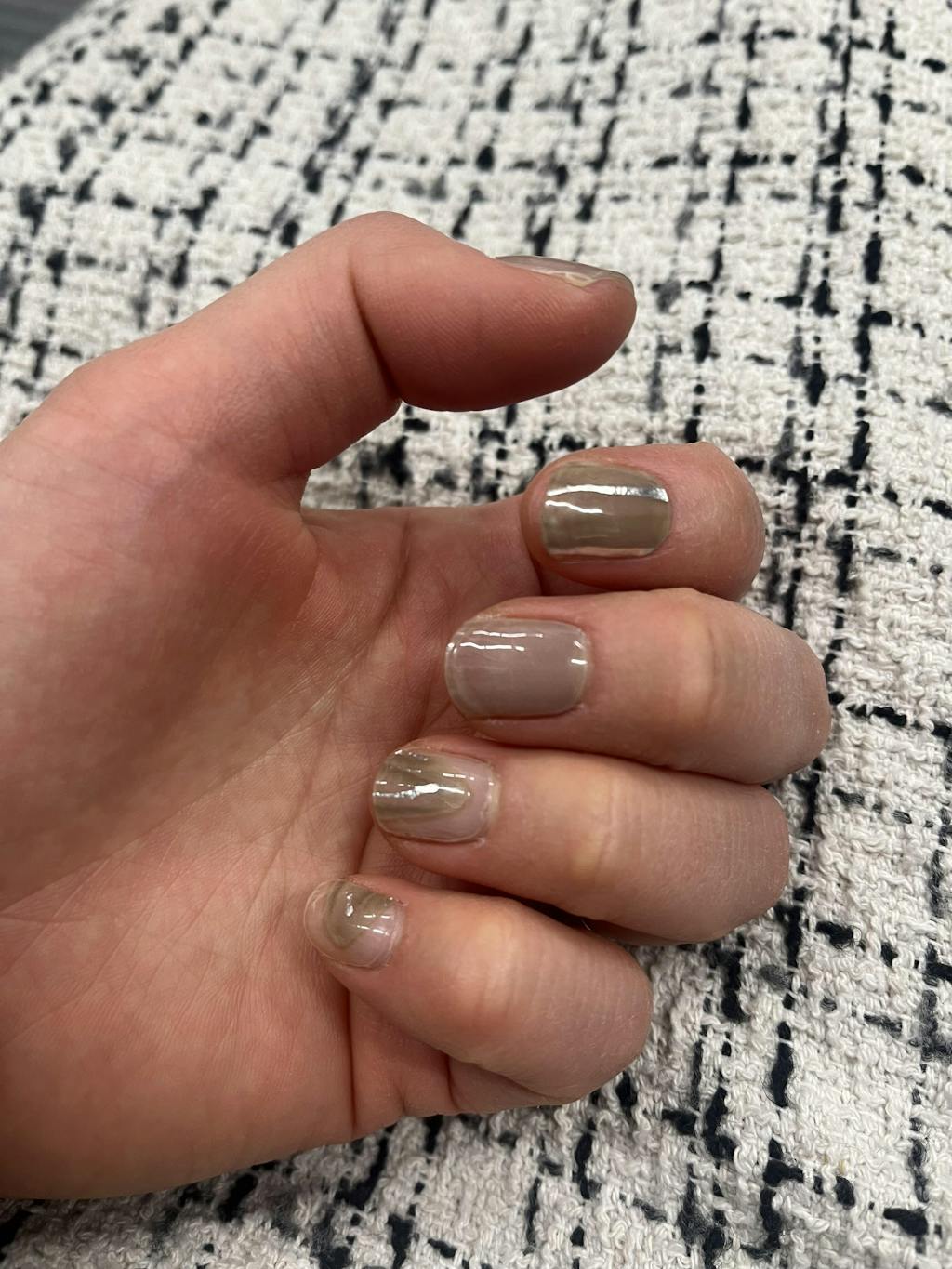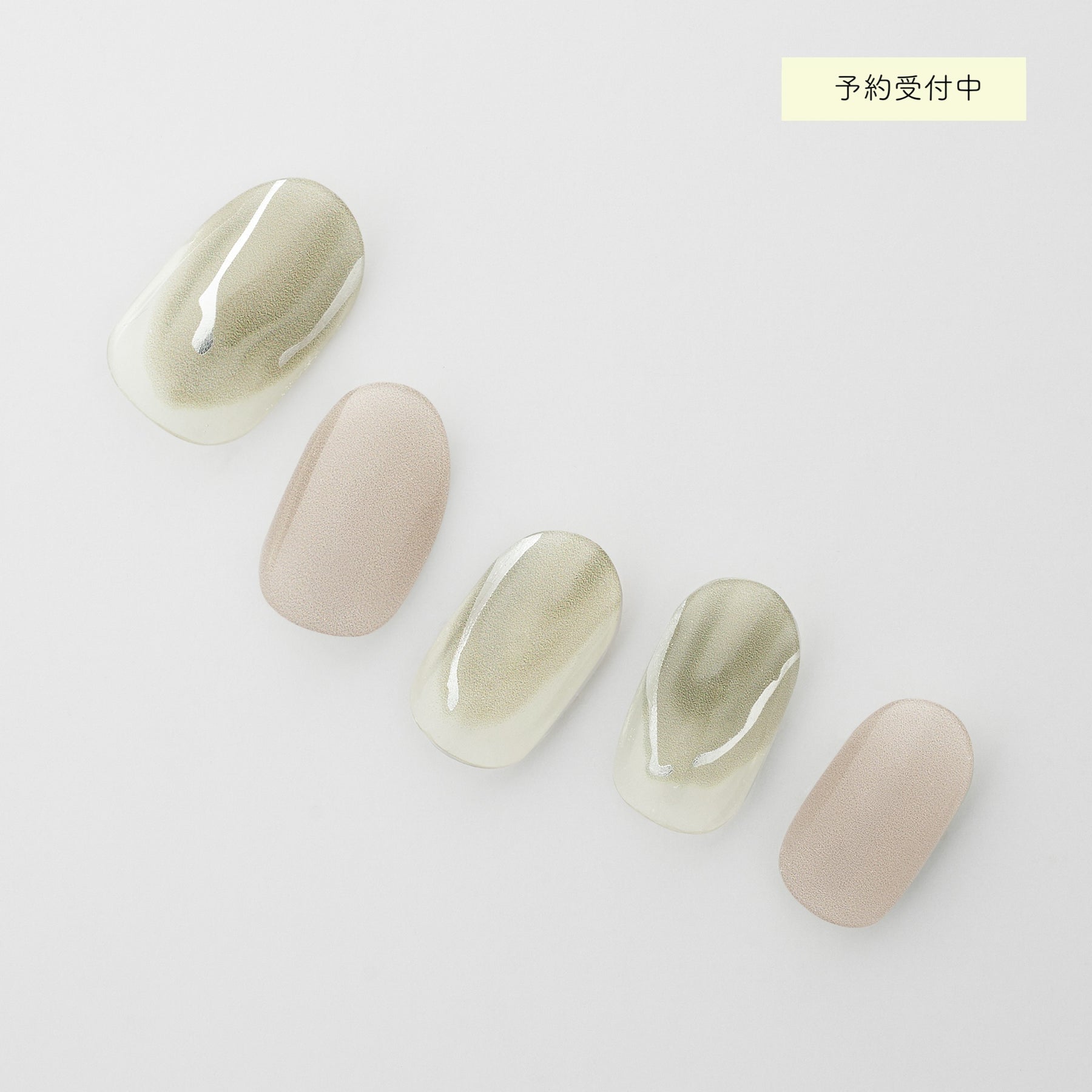 どんな人の日常にも“溶け込む”オーガニックな色味に、アクセントとしてシルバー箔をオン。少し根元に空間を持たせたことでフレンチネイルのようなニュアンスが生まれ、爪が伸びてきてもあまり目立たないことも嬉しいポイント。