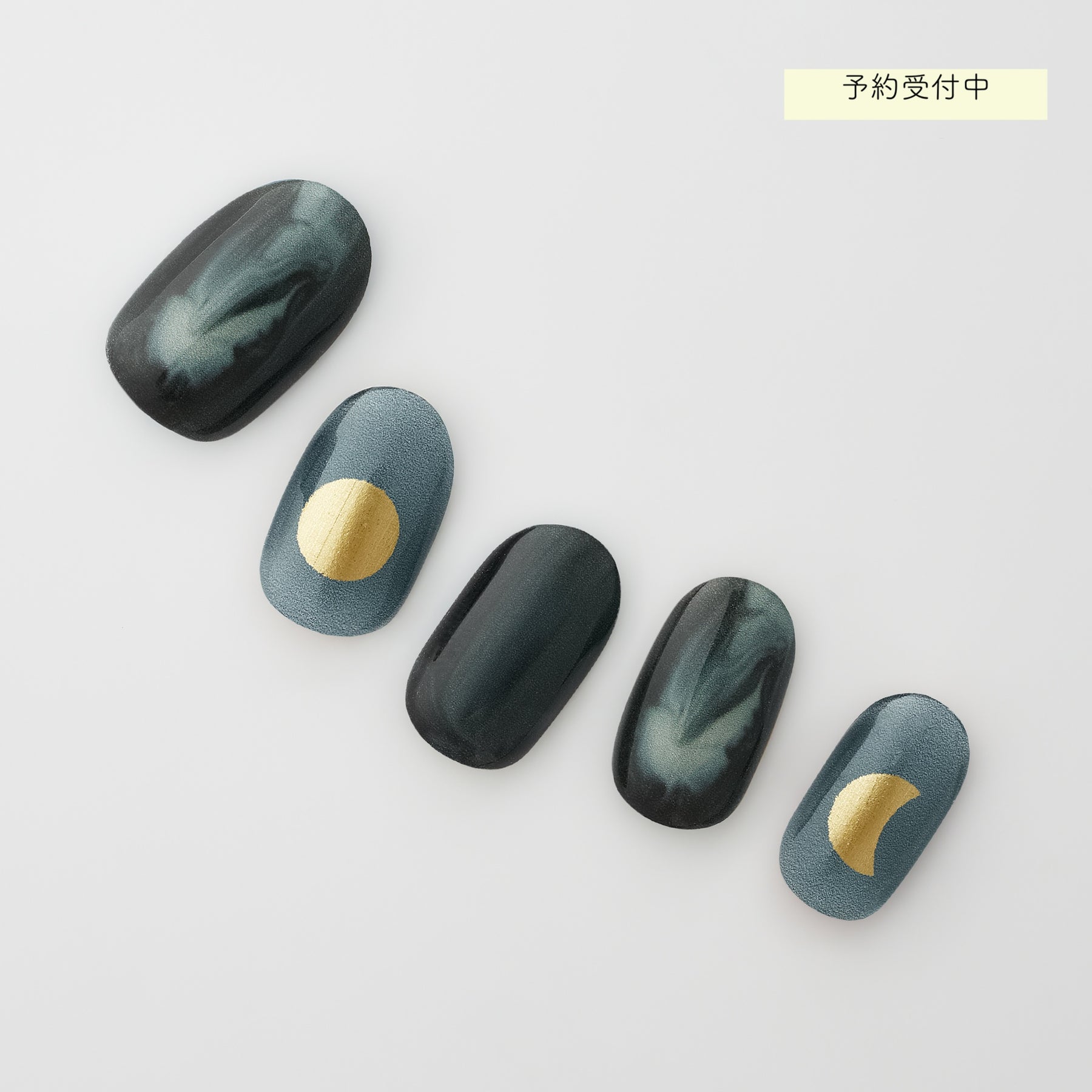 深みのあるダークカラーの中に、やわらかな白い光が差し込むような幻想的なデザイン。夜空に浮かぶ月明かりを思わせるニュアンスで、指先に幻想的な雰囲気をまとわせます。片手には「月の満ち欠け」を表現したデザインを取り入れても、左右で違う組み合わせを楽しんでも○